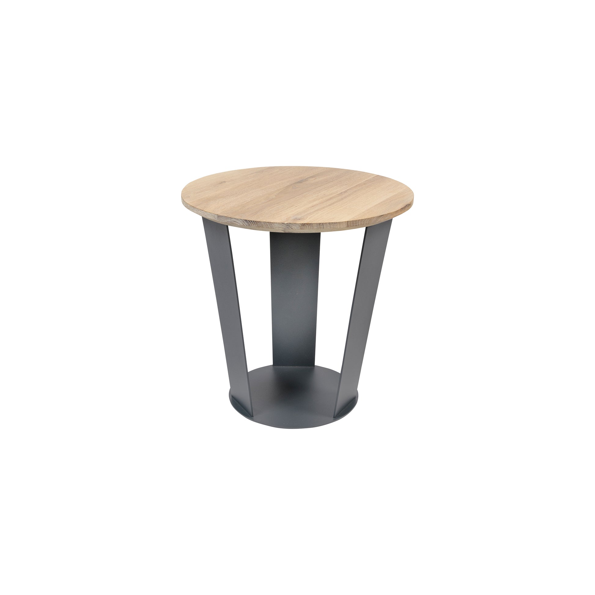 The SHINE series consists of three different sizes, the difference of the side tables is the size because the height is the same. The round top is made of oak (finished in the color bianco) and the frame is made of steel powder coated in the color anthracite.